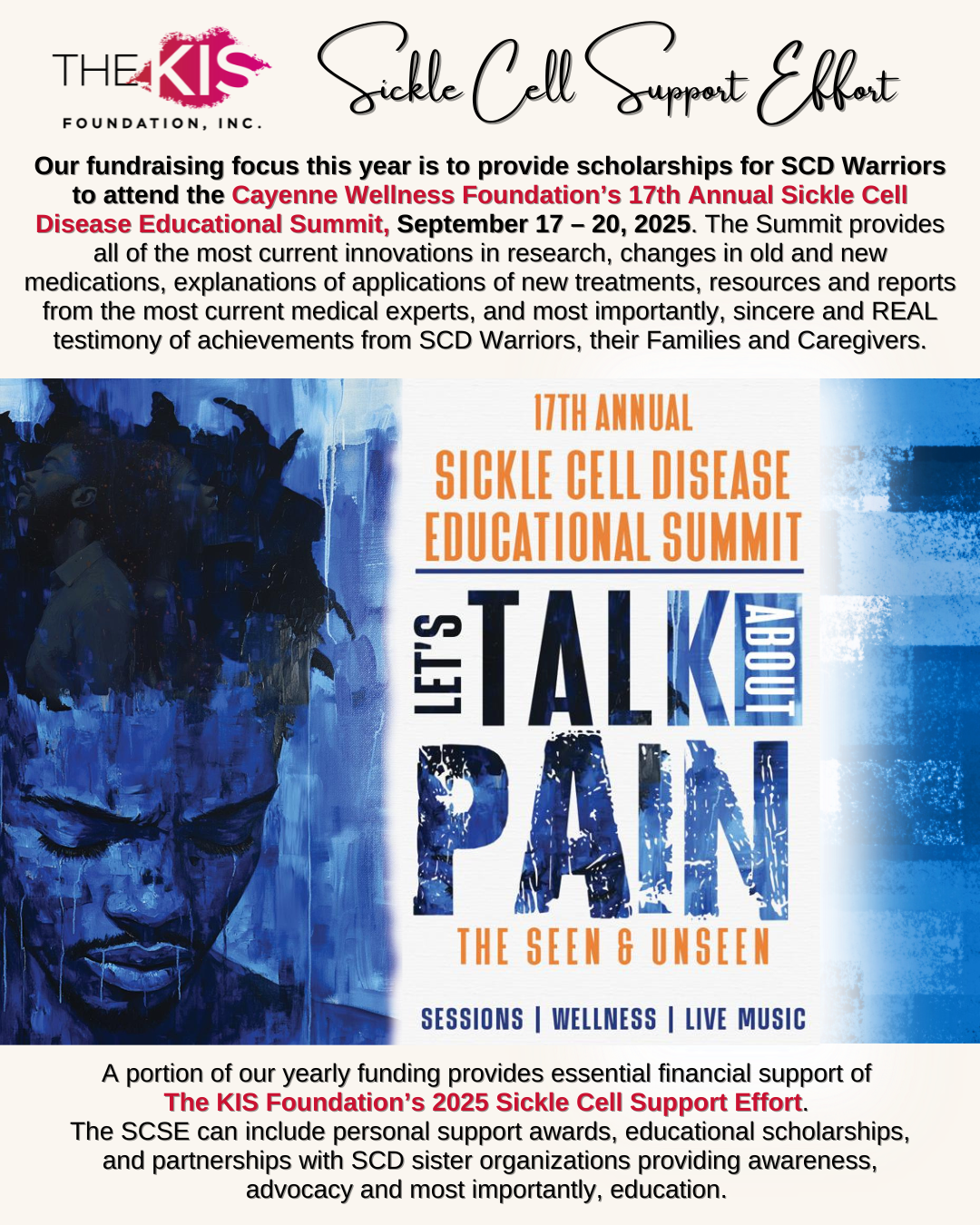 The KIS Foundation, Inc., is pleased to announce the SCD Warriors who were chosen to receive almost $13,000.00 in scholarships funds distributed from the 2025 Sickle Cell Support Effort Program! Each of the seven winners received $1,850.00 to attend the Cayenne Wellness Foundation’s 17th Annual Sickle Cell Disease Educational Summit, that was held on September 17 – 20, 2025 in San Jose, California.